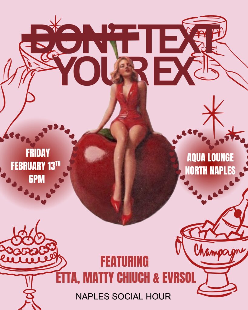 Join us at Aqua Lounge in North Naples on Friday, February 13th for a night of fun, music, and zero texting your ex. Naples Social Hour presents “Don’t Text Your Ex”, kicking off at 6 PM with live music, dancing, and cocktails flowing all night long.